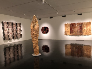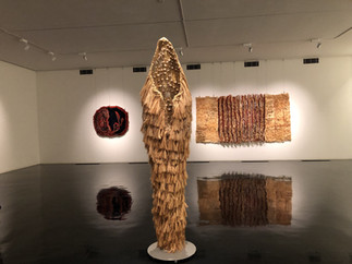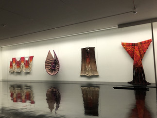 私は大学院修士課程在学中に中野恵美子先生の特別講義を拝聴する機会に恵まれ、先生の作品を初めて知りました。織の技法で芸術表現をすることを学んで間もない学生だった私は、織作品でここまで表現できるのか!と衝撃をうけ、芸術としての織の無限な可能性を感じたことを今でも鮮明に覚えております。 展覧会会場に入ると、人よりもはるかに巨大な、多彩な織の造形作品が迎え入れてくれました。実際に拝見した先生の作品は、想像よりもはるかに雄大かつ緻密な作品で、私は圧倒されるばかりでした。